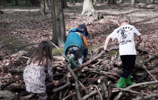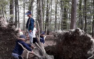 Im Wald wurde es dann praktisch – die Kinder bauten mit viel Begeisterung gleich zwei eigene Brücken. Eine davon erinnerte die Kinder sogar an einen Biberbau! Beim ersten Versuch lief noch nicht alles rund: Äste wurden kreuz und quer gelegt – jede*r machte einfach drauflos. Doch in der gemeinsamen Reflexion fanden die Kinder selbst heraus, woran es lag: Es fehlte die Absprache. Beim zweiten Versuch machten sie es anders – sie planten gemeinsam, tauschten Ideen aus und arbeiteten als Team. Und siehe da: Die Brücke gelang von Anfang an!