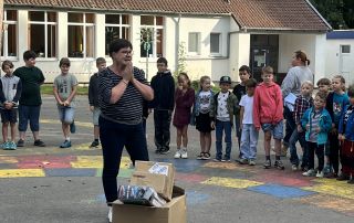 Vor Kurzem konnte unsere Schulleiterin Monika Lücke den Kindern eine besonders tolle Überraschung im Singkreis präsentieren. Dank einer Spende unseres Fördervereins haben die Kinder jede Menge neuer Sachen, wie beispielsweise Schaufeln und Bagger, zum Spielen in den Pausen bekommen.